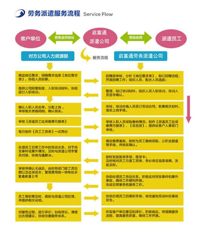 啟富通派遣除承擔一整套人事事務性工作外,同時承擔中華人民共和國《勞動法》、《勞動合同法》規定部分社會保險和醫療保險統籌以外的員工的用工風險和責任。